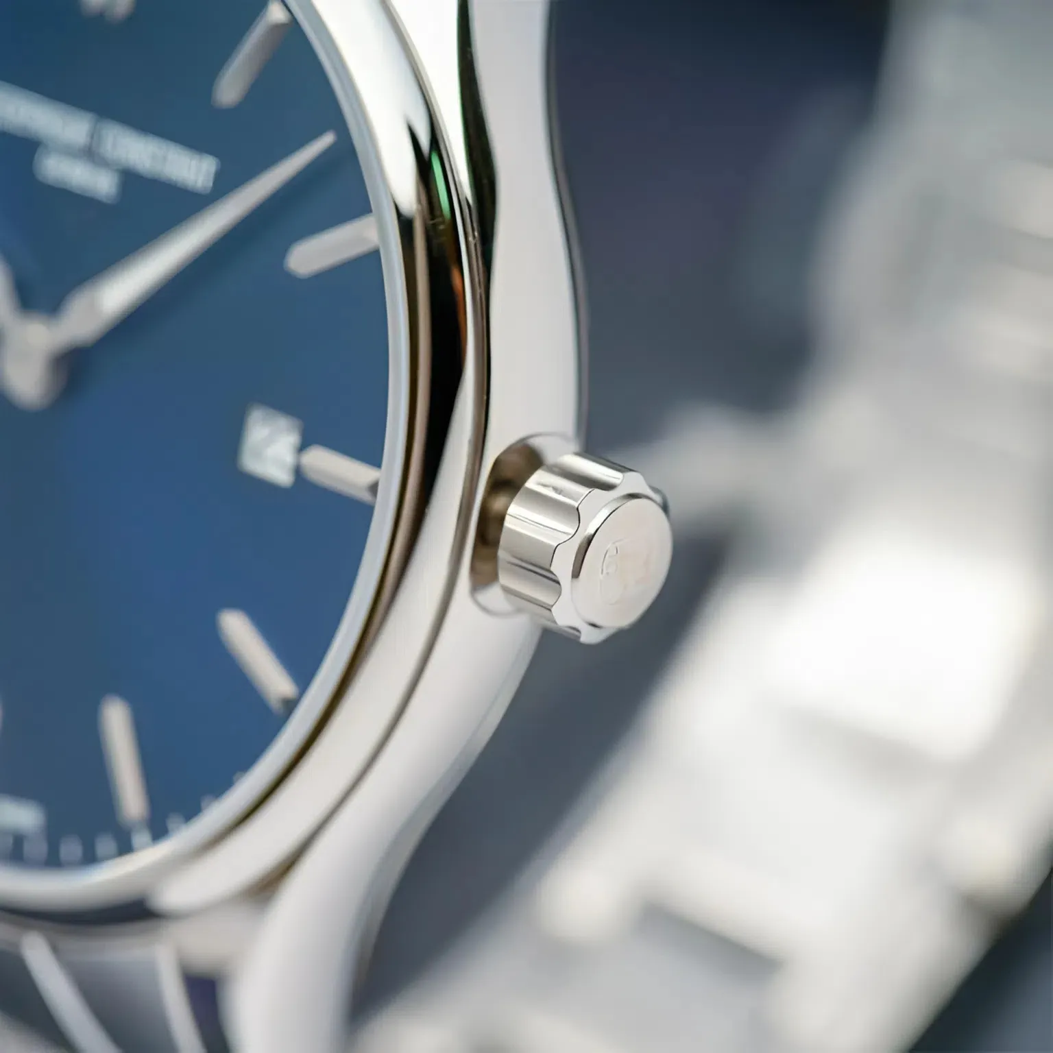 Logo Frederique Constant Genève được in rõ nét tại vị trí 12 giờ, khẳng định xuất xứ danh giá từ thành phố chế tác đồng hồ nổi tiếng thế giới.