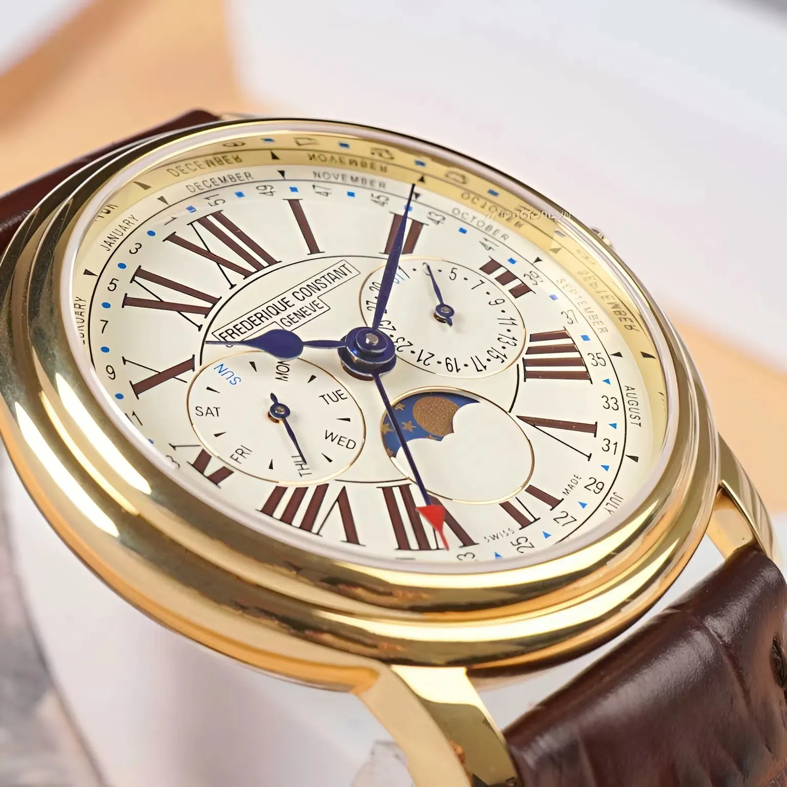 Frederique Constant 40mm Nam FC-270EM4P5 là một minh chứng hùng hồn cho thấy sự phức tạp không nhất thiết phải đi kèm với mức giá xa xỉ. Chiếc đồng hồ này là sự kết hợp hoàn hảo giữa thiết kế Dress Watch cổ điển của Geneva, lớp mạ vàng sang trọng và ba tính năng lịch cùng Lịch Trăng (Moonphase) đầy mê hoặc, biến nó thành một tác phẩm nghệ thuật tinh tế trên cổ tay quý ông.