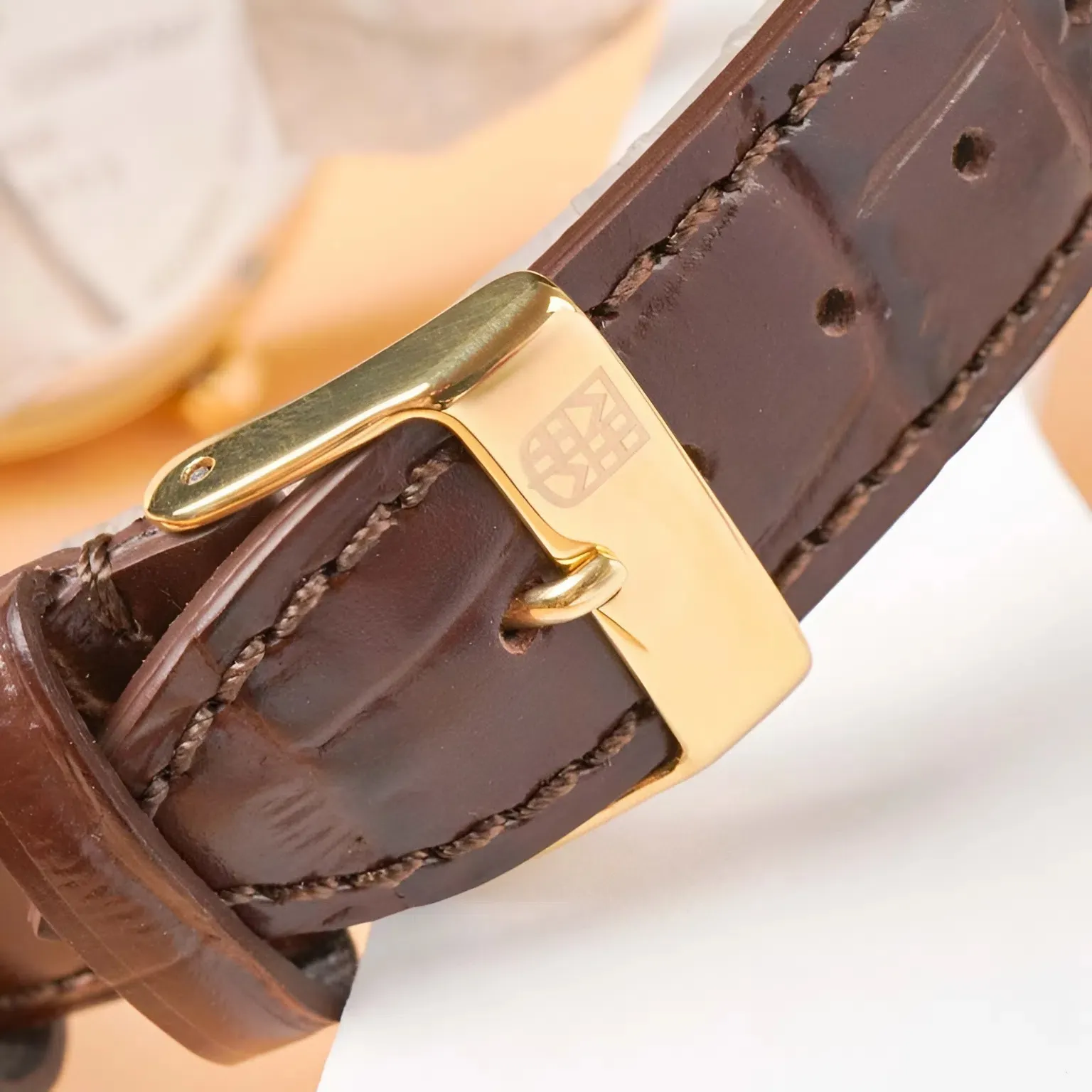 Dây Đeo Hoàn Hảo: Dây da cá sấu (hoặc dập vân) màu nâu sẫm không chỉ mang lại sự thoải mái khi đeo mà còn hoàn thiện tổng thể một cách sang trọng, đúng chuẩn của một chiếc đồng hồ lễ phục.