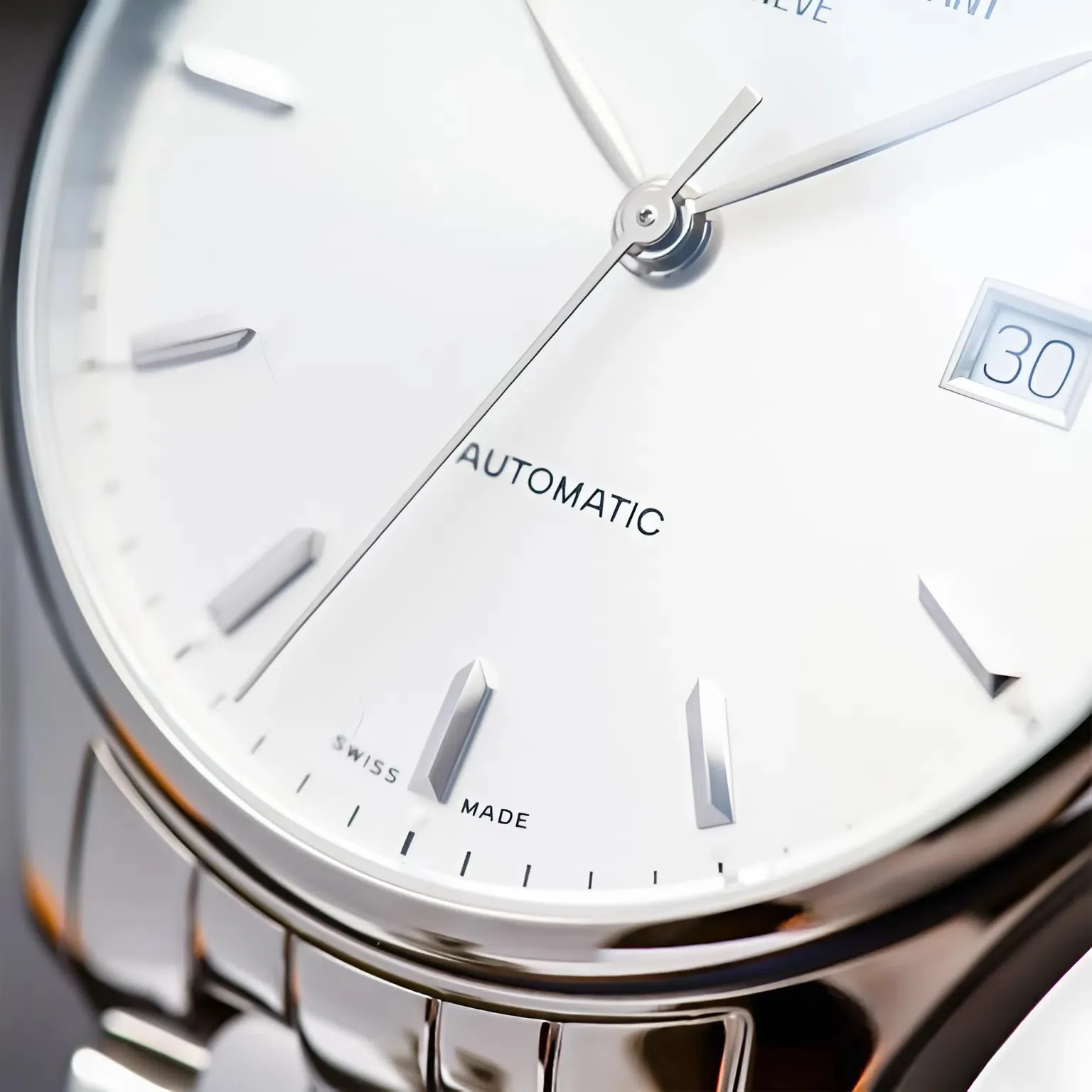 Mặt Số Trắng Bạc Tối Giản: Mặt số màu trắng bạc với hiệu ứng chải tia Sunburst nhẹ nhàng, phản chiếu ánh sáng một cách duyên dáng. Mặt số chỉ sử dụng cọc số vạch (Index Markers) và kim thanh mảnh, loại bỏ mọi chi tiết thừa, tạo cảm giác thoáng đãng và dễ đọc.