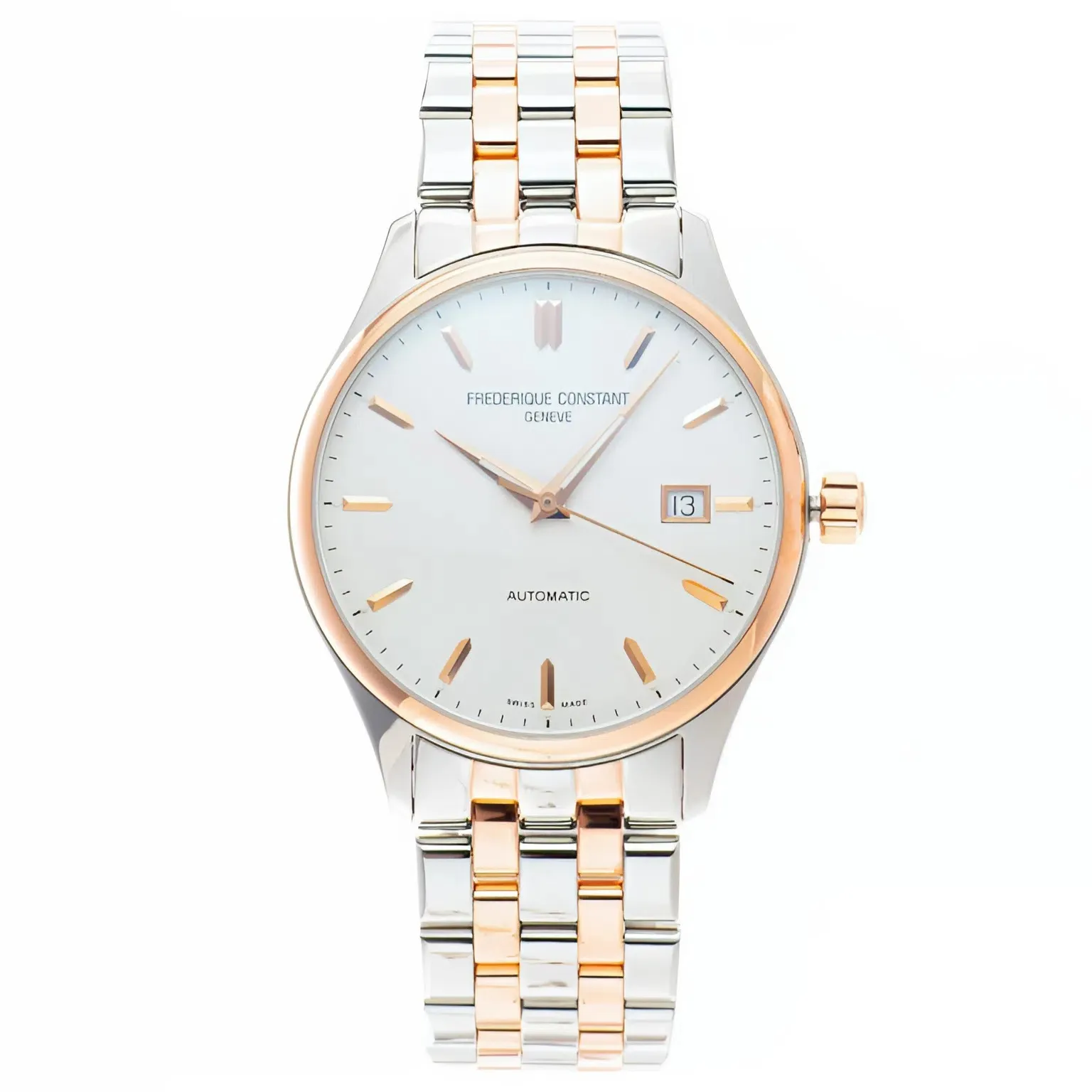 Mặt số màu trắng bạc ánh ngọc trai, điểm nhấn là cọc số La Mã truyền thống và kim dauphine mạ vàng – biểu tượng cho phong cách Frederique Constant cổ điển, quý phái và dễ nhận diện.