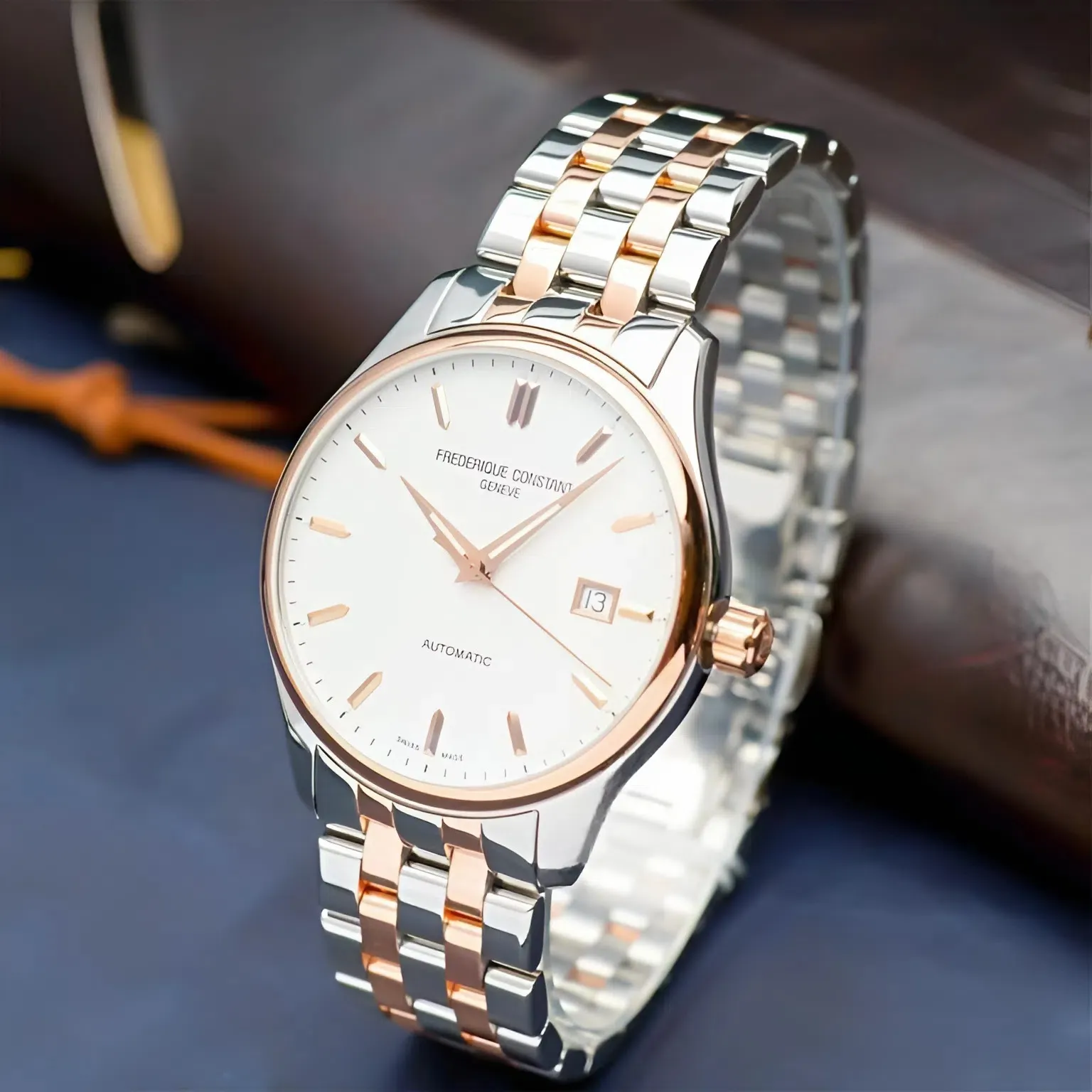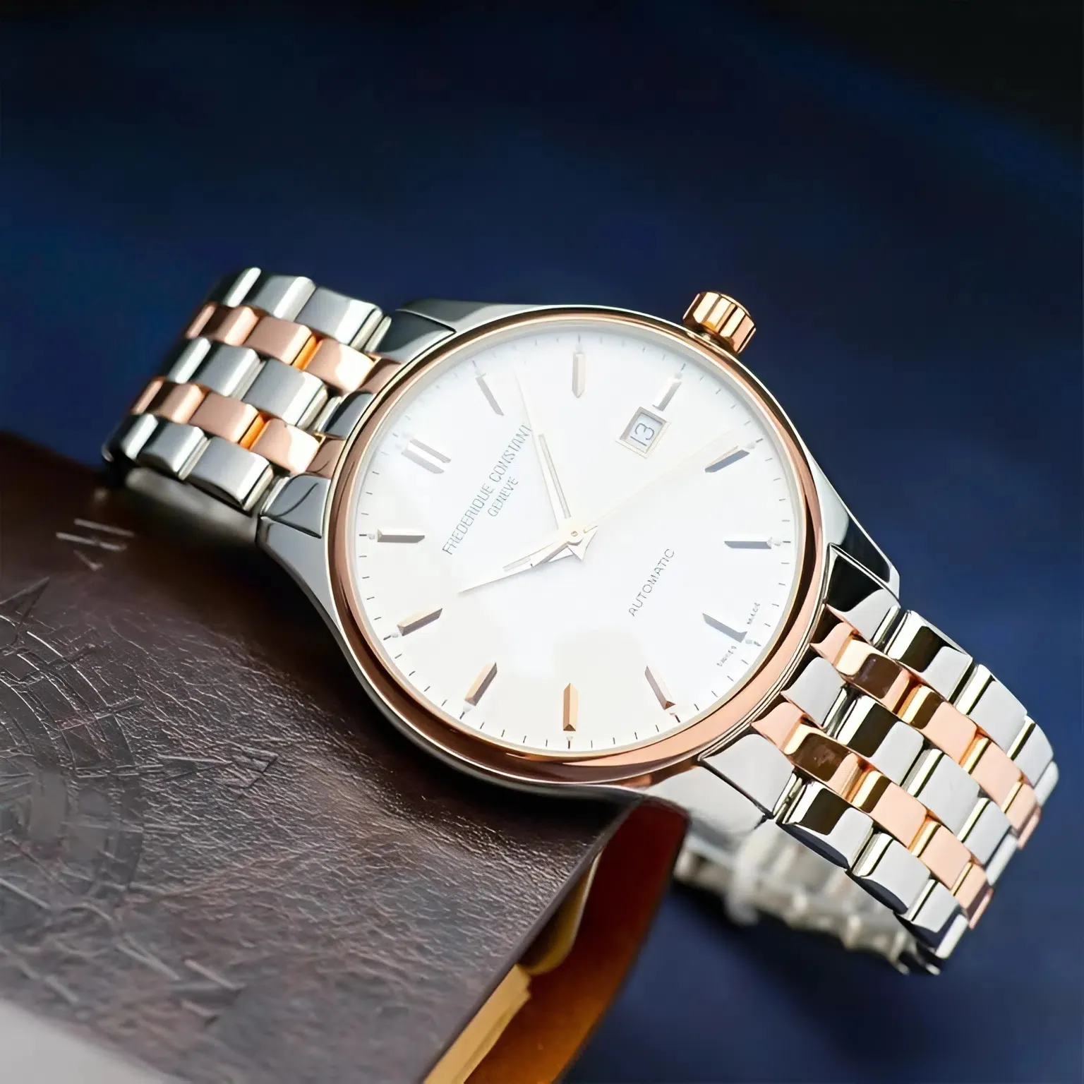 Dây da cao cấp được hoàn thiện thủ công, kết hợp khóa gập mạ vàng hồng khắc logo Frederique Constant, đảm bảo tính an toàn và độ bền theo thời gian.