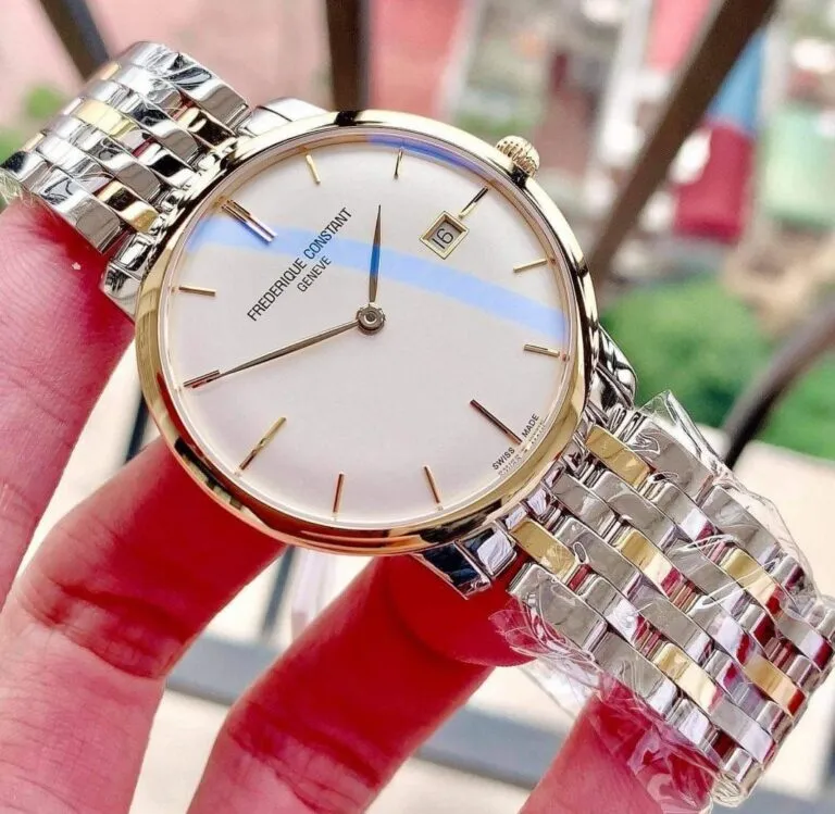 Frederique Constant khéo léo kết hợp vàng ánh kim và thép bạc sáng để tạo nên tổng thể hài hòa, sang trọng mà không quá phô trương.