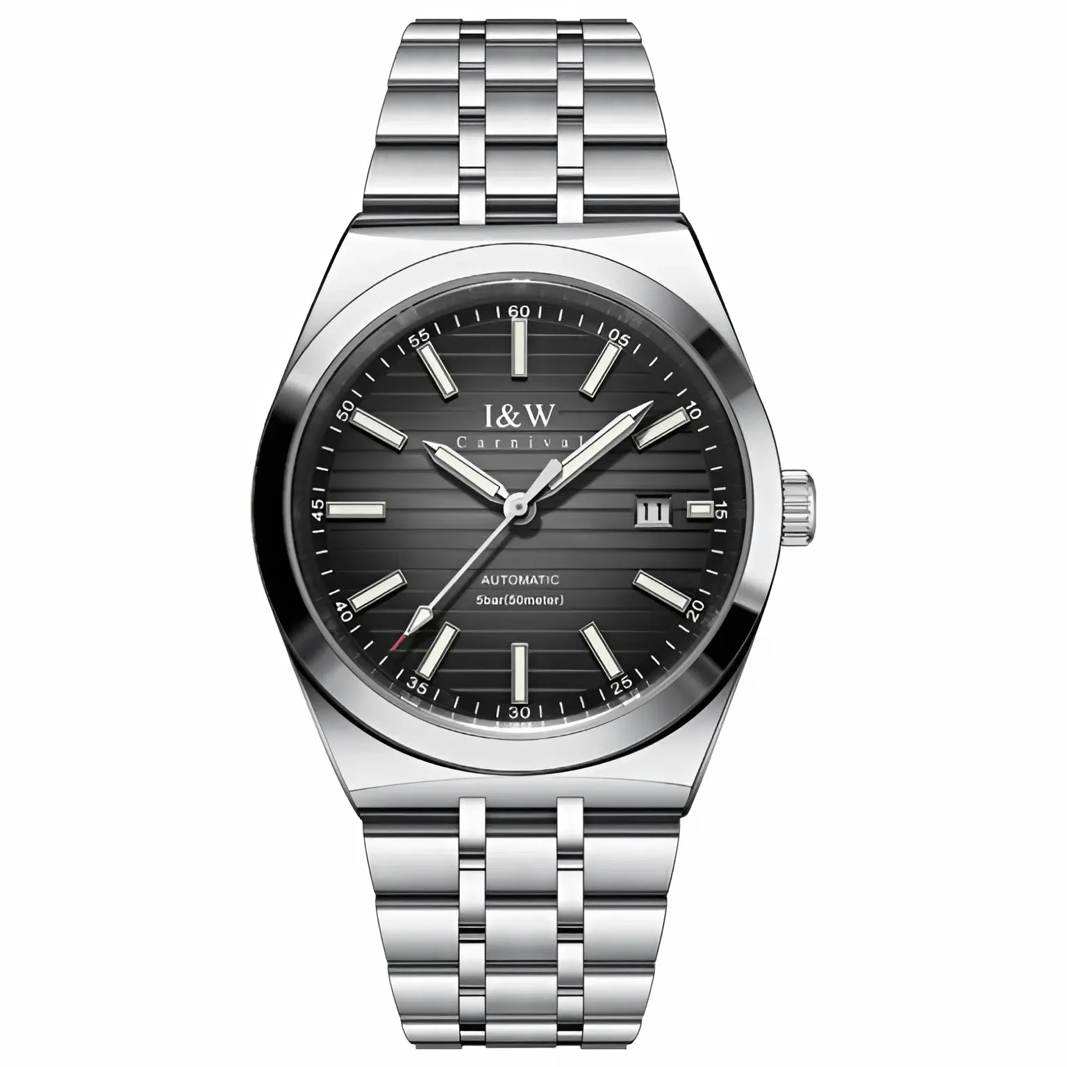 Điểm nhấn đầu tiên khiến Đồng Hồ I&W Carnival 41mm Nam 712G4 trở nên khác biệt chính là bộ vỏ được chế tác từ thép không gỉ 316L cao cấp. Nhà sản xuất đã cực kỳ khéo léo khi kết hợp kỹ thuật phay xước mờ trên bề mặt vành bezel và đánh bóng gương ở các cạnh viền.