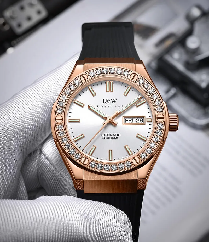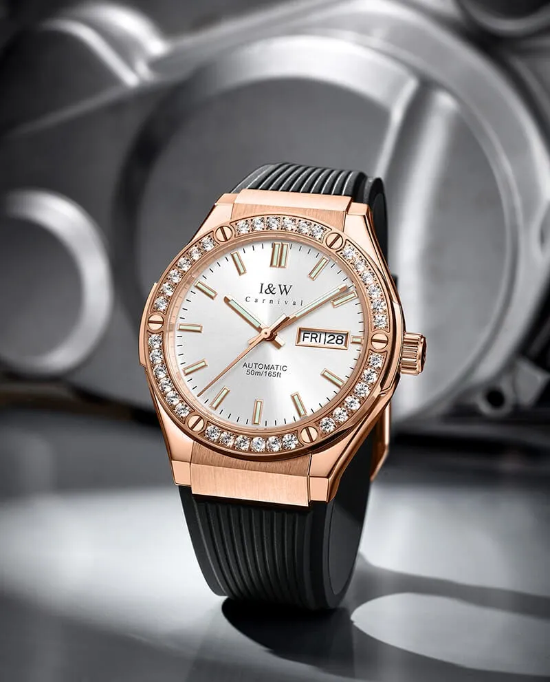 Trong phân khúc đồng hồ Lux-Sport (thể thao sang trọng), việc tìm kiếm một cỗ máy vừa có sự cứng cáp, vừa mang hơi thở quý tộc không phải là điều dễ dàng. Tuy nhiên, Đồng hồ I&W Carnival 42mm Nam 55851G-VH-DCS-T đã xuất hiện như một lời giải hoàn hảo. Với sự kết hợp giữa vỏ vàng hồng rực rỡ và dây cao su hiện đại, đây chính là món phụ kiện tối thượng để phái mạnh khẳng định vị thế.
