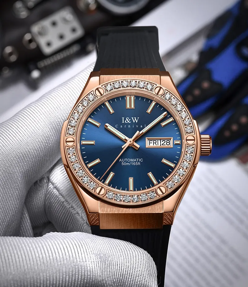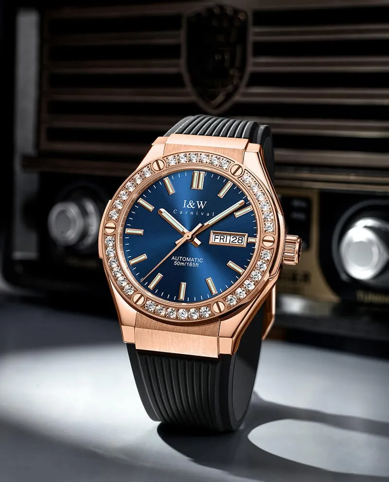 Nếu bạn đang tìm kiếm một cỗ máy thời gian vừa mang nét năng động của dòng đồng hồ thể thao, vừa sở hữu vẻ hào nhoáng của những món trang sức cao cấp, thì Đồng Hồ I&W Carnival 42mm Nam 55851G-VH-DCS-X chính là câu trả lời hoàn hảo. Đây là sự kết hợp táo bạo giữa vỏ vàng hồng, vành đính đá lấp lánh và dây đeo cao su bền bỉ, tạo nên một phong cách không thể hòa lẫn.