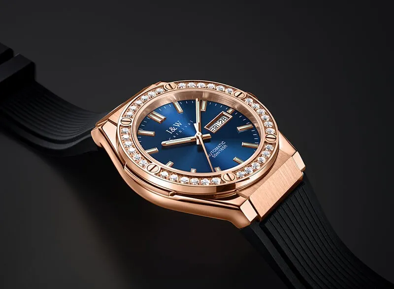 Điểm đắt giá nhất trên chiếc Đồng Hồ I&W Carnival 42mm Nam 55851G-VH-DCS-X chính là phần vành bezel. Thay vì những đường khía hay đánh bóng thông thường, I&W đã sử dụng kỹ thuật đính đá quý tinh xảo bao quanh mặt số. Những viên đá được tuyển chọn kỹ lưỡng, có độ tinh khiết cao, giúp đồng hồ tỏa sáng rực rỡ ngay cả trong điều kiện ánh sáng yếu. Kết hợp cùng lớp mạ vàng hồng (Rose Gold) thời thượng, chiếc đồng hồ toát lên vẻ quyền quý và đẳng cấp của một quý ông thượng lưu.