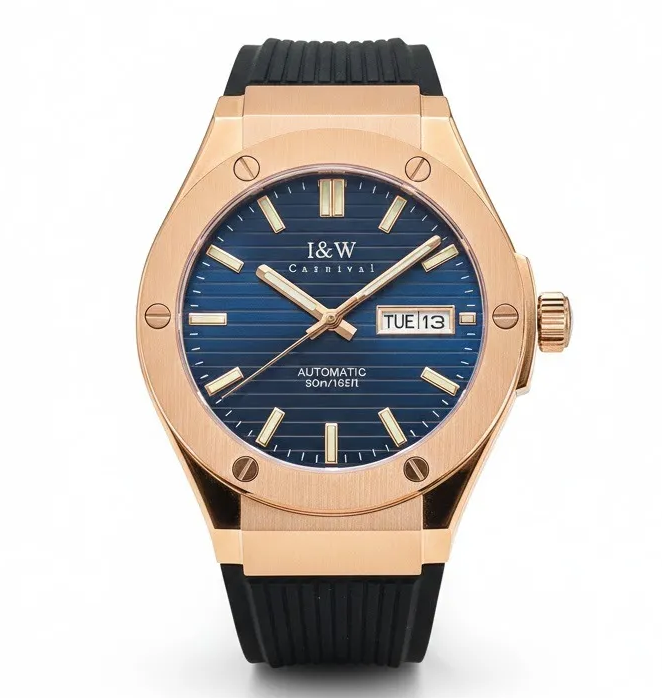Trong thế giới đồng hồ nam cao cấp, I&W Carnival luôn biết cách làm say đắm giới mộ điệu bằng những thiết kế độc bản, mang đậm tính nghệ thuật. Đồng Hồ I&W Carnival 42mm Nam 55851GT-VH-DCS-X chính là một ví dụ điển hình cho sự kết hợp táo bạo giữa vẻ đẹp hào nhoáng của vành đính đá quý và nét năng động của dây đeo cao su đen, tạo nên một phong cách "Hybrid" vô cùng lôi cuốn.