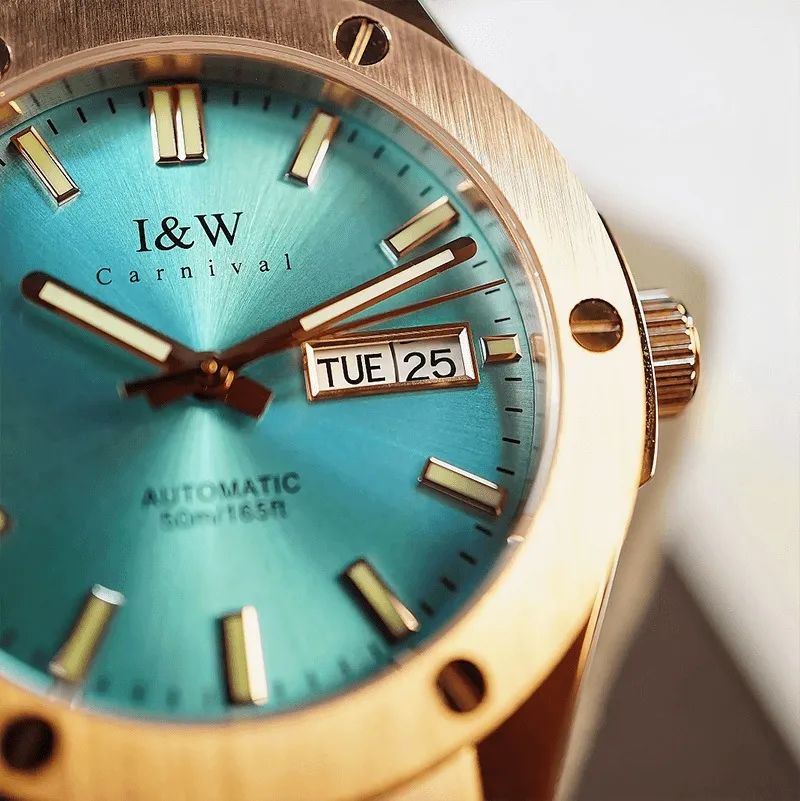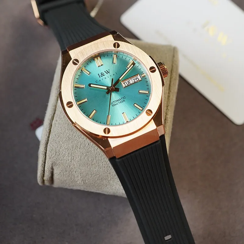 Trong phân khúc đồng hồ nam tầm trung, hiếm có cái tên nào tạo được sức hút mạnh mẽ như Đồng Hồ I&W Carnival 42mm Nam 55851GT-VH-DCS-XT. Đây không chỉ là một công cụ xem giờ mà còn là một món trang sức thể hiện bản lĩnh quý ông. Sự kết hợp giữa bộ vỏ mạ vàng hồng xa xỉ, dây đeo cao su năng động và mặt số xanh Tiffany thời thượng đã tạo nên một tổng thể "Sport-Luxury" chuẩn mực, sẵn sàng cùng bạn chinh phục mọi ánh nhìn.