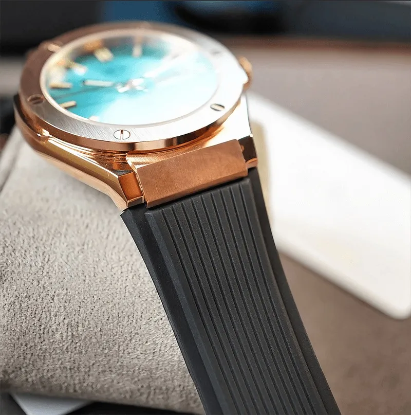 Sự kết hợp giữa vỏ vàng hồng và dây cao su đen tạo nên một phong cách tương phản đầy ấn tượng. Đây là lựa chọn lý tưởng cho những người đàn ông hiện đại, thường xuyên di chuyển và yêu thích các hoạt động ngoài trời nhưng vẫn muốn giữ diện mạo lịch lãm.