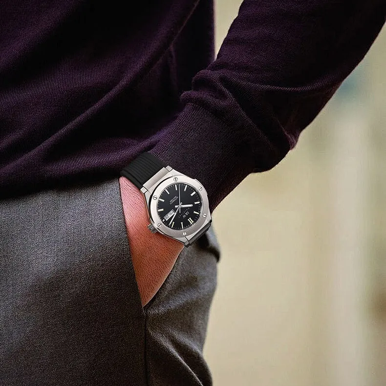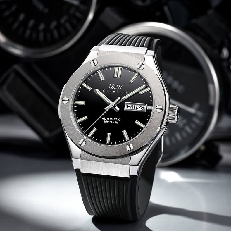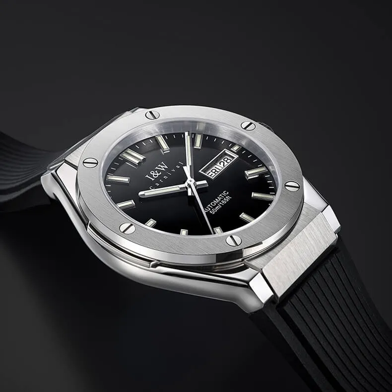 Một trong những lý do khiến Đồng hồ I&W Carnival 42mm Nam 55851GT-VT-DCS-D trở nên khác biệt chính là bộ dây cao su cao cấp (DCS). Thay vì cảm giác nặng nề của dây thép hay sự cứng nhắc của dây da, dây cao su mang đến sự mềm mại tuyệt đối và ôm sát cổ tay.