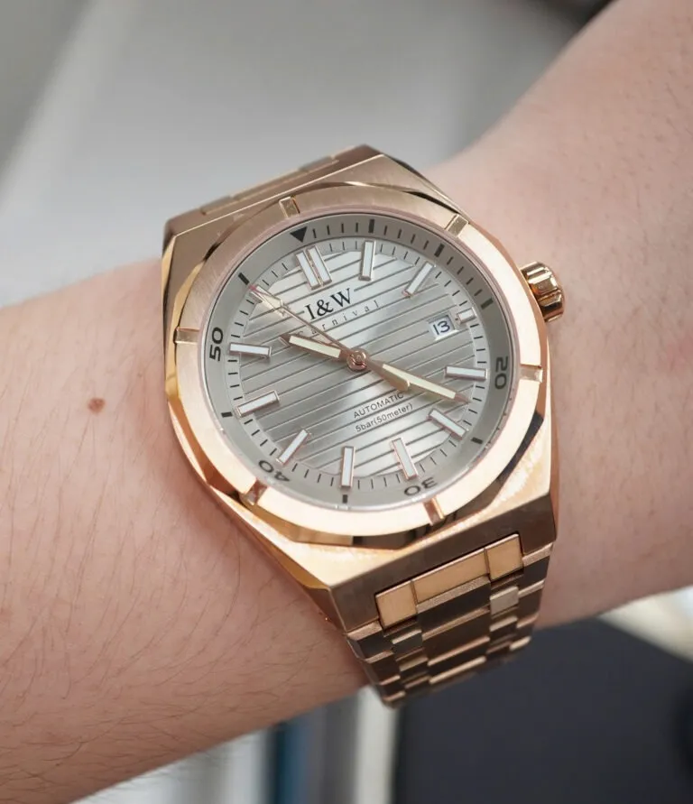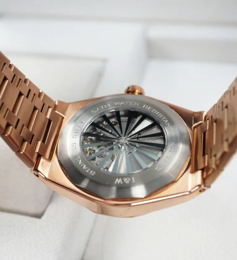 Kích thước mặt 42mm tạo nên sự hiện diện vững chãi trên cổ tay. Đặc biệt, toàn bộ phần vỏ và dây đeo được mạ vàng hồng PVD – sắc màu tượng trưng cho sự thịnh vượng và quý phái. Màu vàng hồng này không quá chói gắt, mang lại nét ấm áp và cực kỳ tôn da cho phái mạnh châu Á.