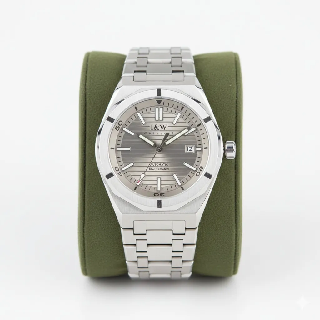 Sức hấp dẫn của Đồng Hồ I&W Carnival 42mm Nam 711G-VT-T nằm ở mặt số (dial) màu xám (Grey Dial). Gam màu trung tính này không chỉ dễ phối đồ mà còn toát lên vẻ sang trọng, trầm mặc.