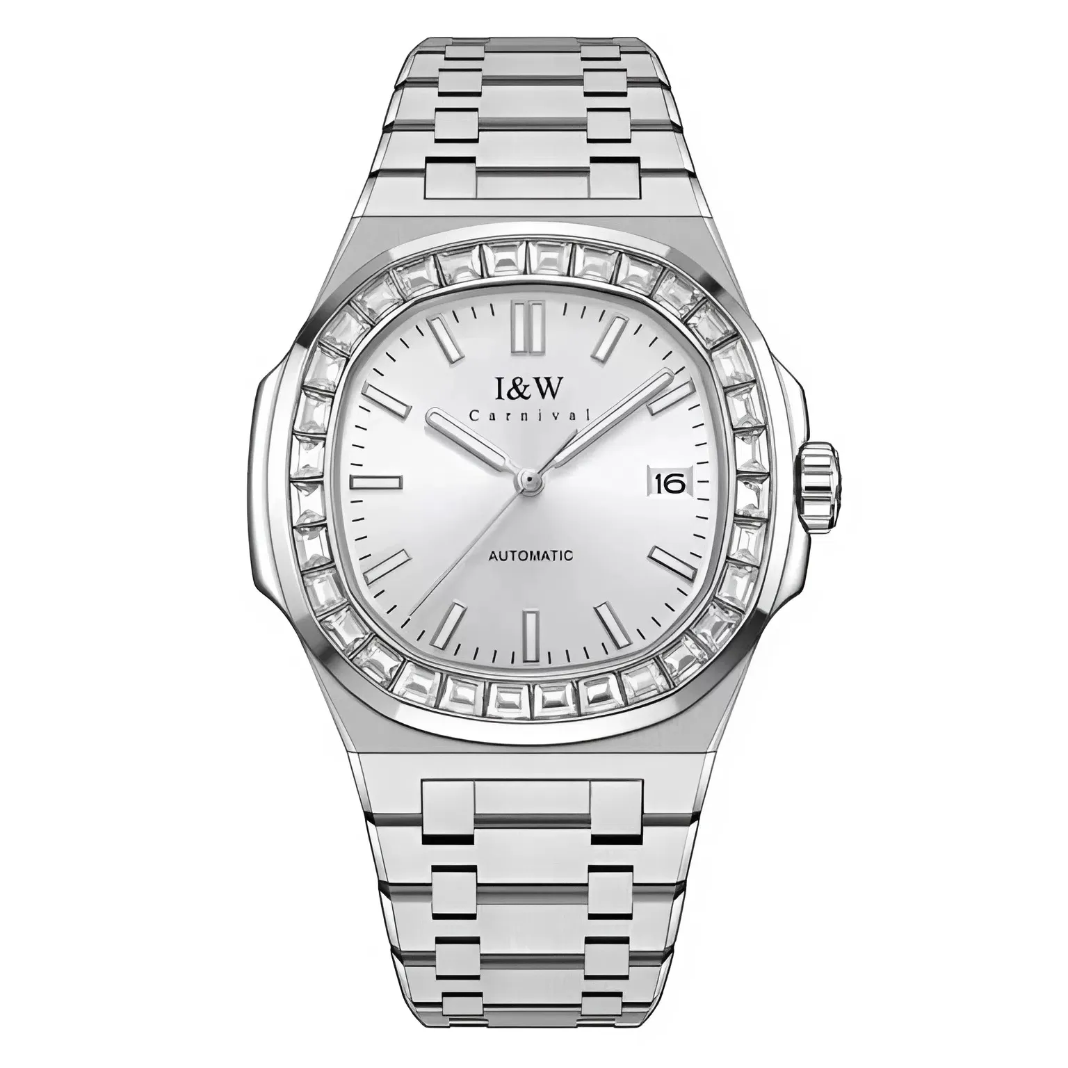 Điểm làm nên sức hút mãnh liệt nhất của chiếc Đồng Hồ I&W Carnival 42mm Nam 750G-VT-T chính là phần vành bezel được đính những viên đá trắng cao cấp cắt theo hình chữ nhật (Baguette). Khác với kiểu đính đá tròn thông thường, đá Baguette mang lại vẻ ngoài mạnh mẽ, hiện đại và vô cùng sang trọng. Mỗi viên đá được tuyển chọn kỹ lưỡng, bắt sáng cực tốt, giúp chiếc đồng hồ luôn rực rỡ và thu hút mọi ánh nhìn dù ở bất cứ đâu.
