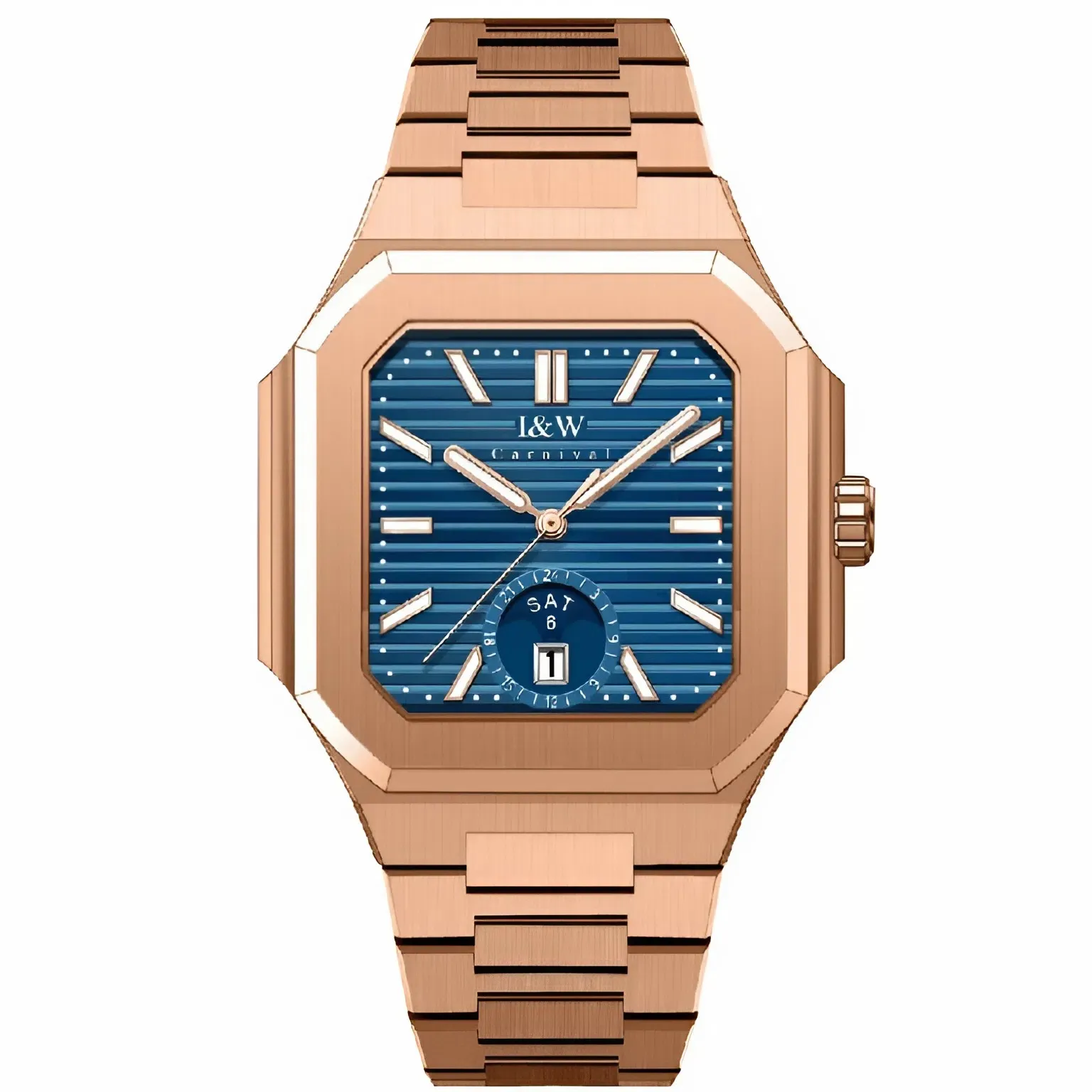 Trong thế giới đồng hồ nam, nếu những thiết kế mặt tròn đại diện cho sự cổ điển thì mặt vuông bo góc chính là biểu tượng của sự phá cách và tinh thần kiến trúc hiện đại. Đồng hồ I&W Carnival 44mm Nam 55876G15 xuất hiện như một làn gió mới, kết hợp hoàn mỹ giữa nghệ thuật chế tác cơ khí Thụy Sĩ và phong cách thể thao sang trọng (Lux-Sport). Với sắc xanh Navy lôi cuốn quyện cùng vỏ vàng hồng thời thượng, đây chính là món phụ kiện giúp quý ông khẳng định vị thế độc bản của mình.