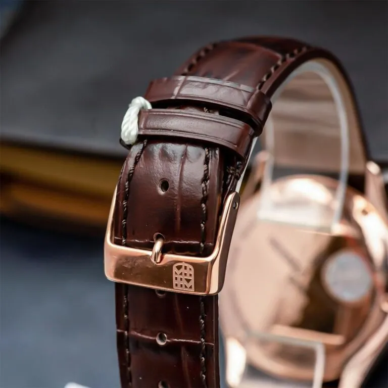 Phần vỏ đồng hồ được chế tác từ thép không gỉ 316L cao cấp, phủ lớp mạ PVD vàng hồng – công nghệ hiện đại giúp tăng độ bền màu và chống oxi hóa. Sự kết hợp với dây da nâu thật cao cấp mang lại cảm giác mềm mại, ôm tay và tạo nên nét đẹp đậm chất cổ điển.